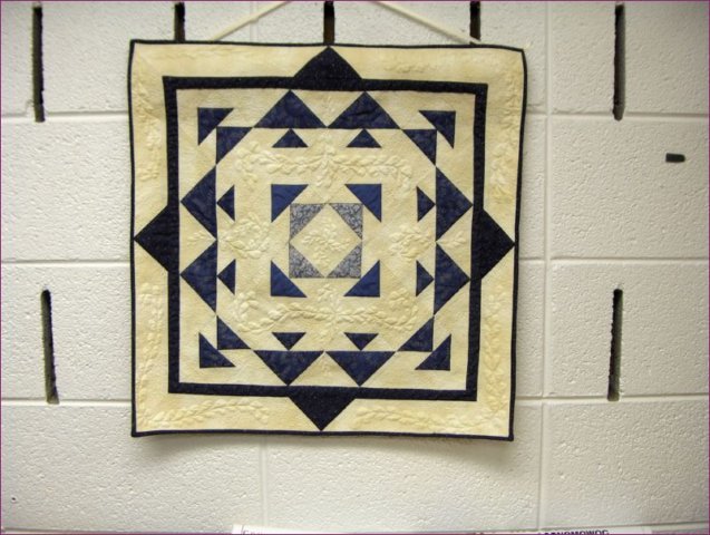QuiltBob Confused Geese - Blue and cream fabrics, designed in EQ. Inspired by the way geese in our area tend to fly north and south as I pass them on the way to work in fall. The interstate crosses forest and wetlands and I know the geese are following their food, but I seems to me they can't make up their minds what season it is!