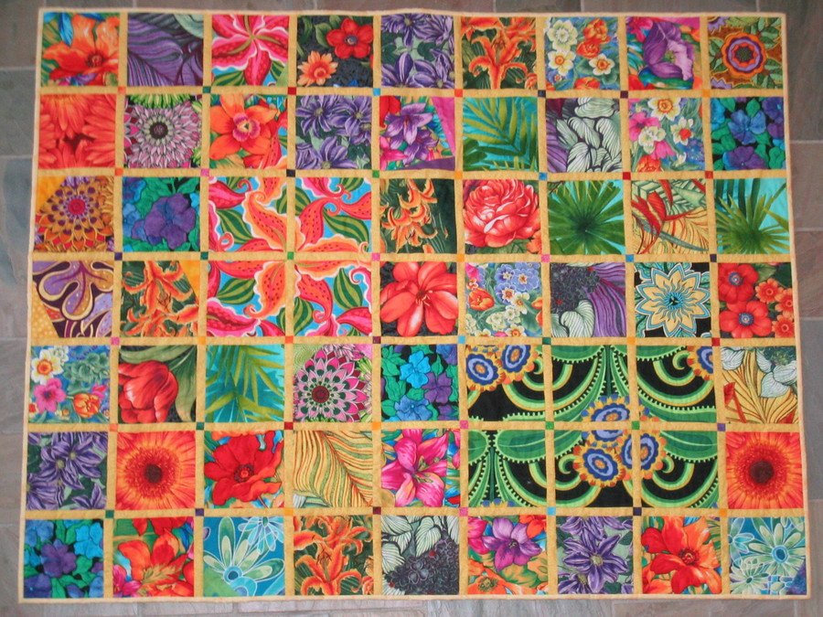jlcwiz Big Flowers - A simple, bright quilt of plain squares with sashing and corner stones.