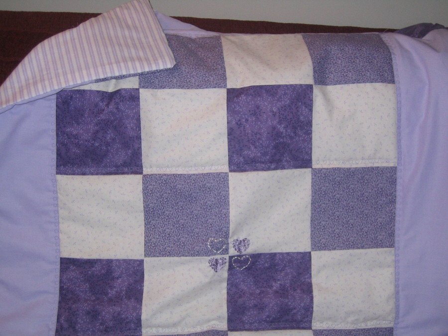 nyashley First Baby Quilt - I just picked out some fabrics and started sewing! I heard you should use polyester batting for baby quilts, but in the end I've found I prefer cotton. But practice makes perfect! I thought for sure my sister was having a girl, but now we've learned she's having another boy! Oh well, I guess they'll have to try again. I added some embroidered hearts in the middle, because I'm an experienced embroiderer, but this was only my first quilt, so I thought I should jazz it up a little.