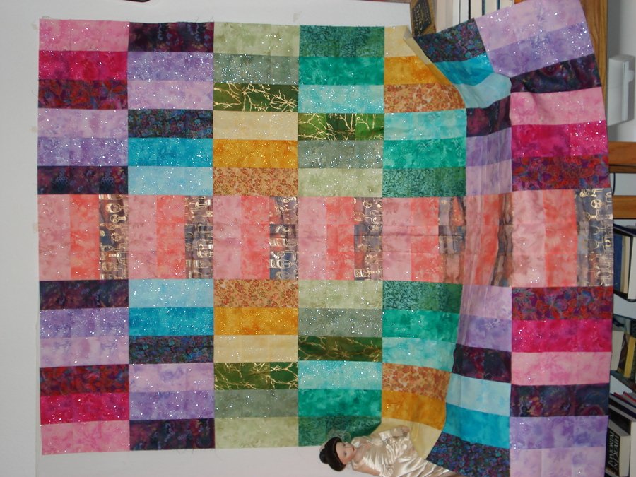 | Design Source - Description | A WIP that is just MY way of laying out my 9 patch blocks - the fabric is what is lovely - jewel tones with sparkly glitter embedded in the fabric. Haven't decided on a border yet. Any suggestions?? |