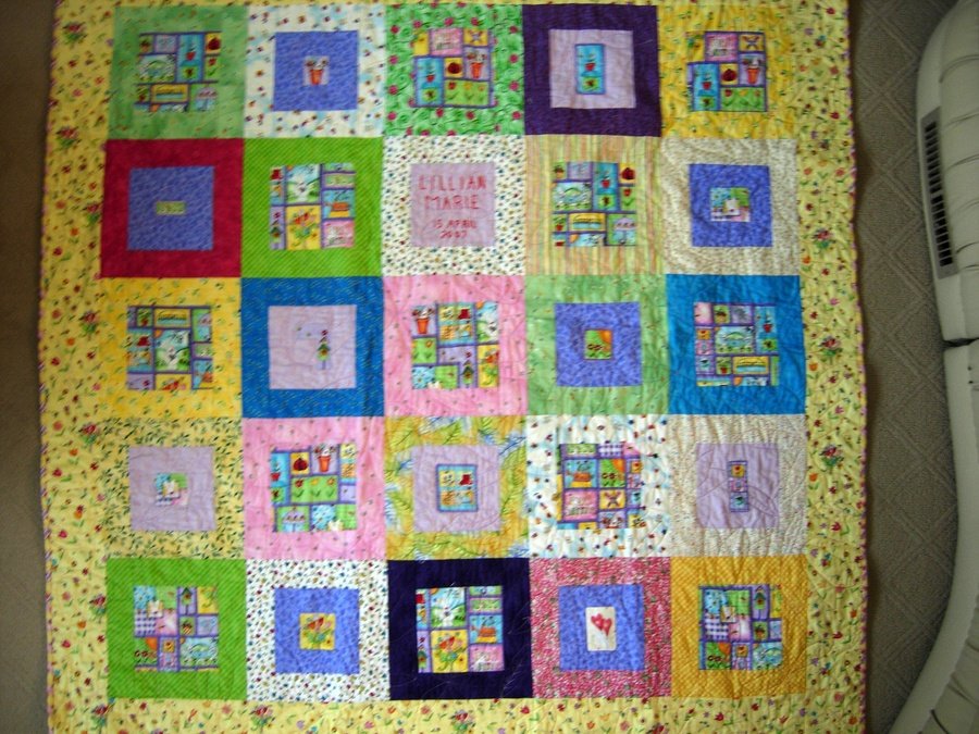 Far2go Happy Spring - Quilt is for Great-Grandaughter #1 on a wonderful spring day! Some quilt squares were fussy-cut. Most of the fabric came from my stash. (Yes, DH, I do use my stash.) Backing includes appliqued alphabet for future learning. Also made pillow cover of scraps which could be used for quilt storage.