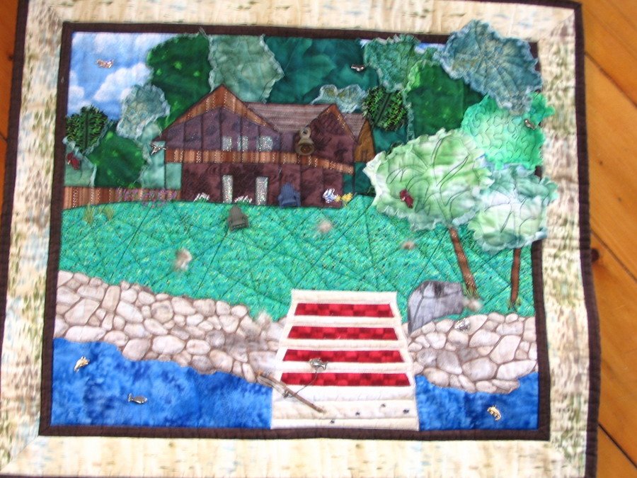 mombeebe Lake House - Designed the quilt from a photo taken of the lake house where my sisters and I have an annual reunion. I did the quilt, then all "the girls" brought charms, buttons, etc, and we used these as well as embroidery to embellish the surface. It was given to my cousin, the home-owner, as a thank-you gift.