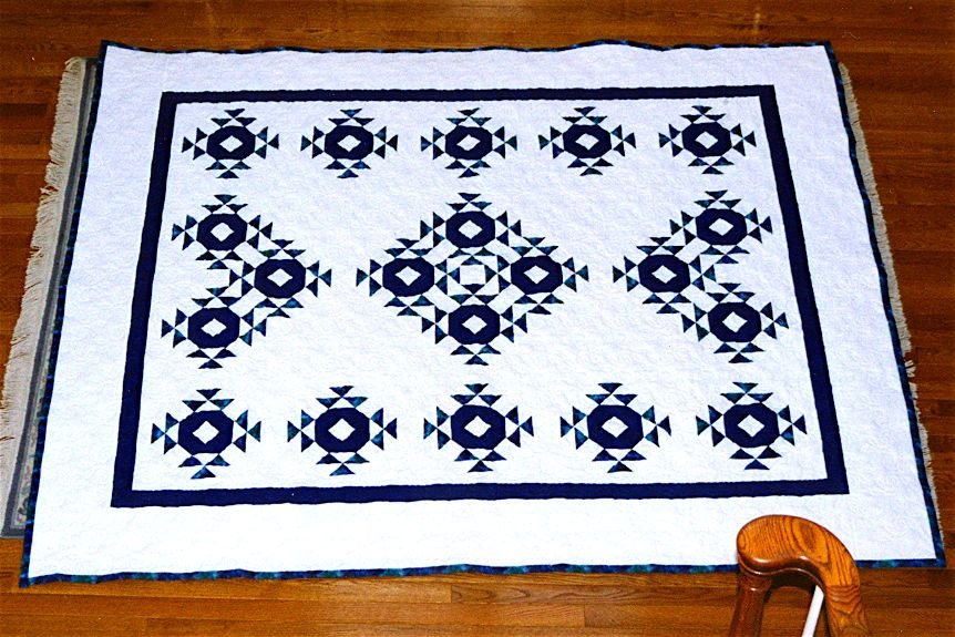 kimmquilt Allison's Graduation Quilt - Allison picked this mostly white quilt out of the book Quilting Makes the Quilt for her high school graduation quilt which she took away to college for use on her bed in the dorm. I envisioned it returning home in tatters but that was not the case at all. She took very good care of it. But she still enjoyed her life at Villanova and I received many compliments from parents of her room mates. The saddest thing was her freshmen year room mate was killed just after graduation in a deck collapse out in the Chicago area. Allison and I attended her memorial service on the Villanova campus. I will post Allison's wedding quilting made in 2005 soon.
