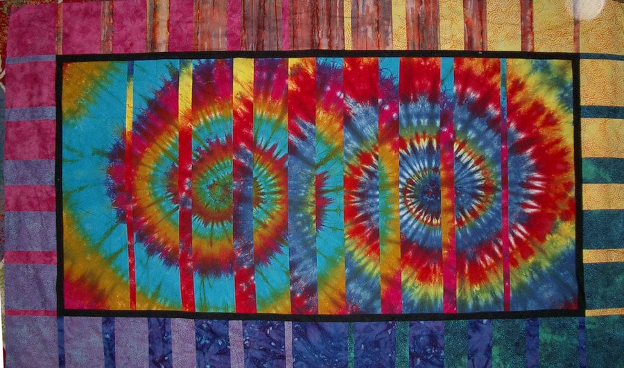 | Design Source - Description | Hand dyed spirals with a batik convergence border. This is a top only, that I'm going to be making into Roman blinds for my living room. |