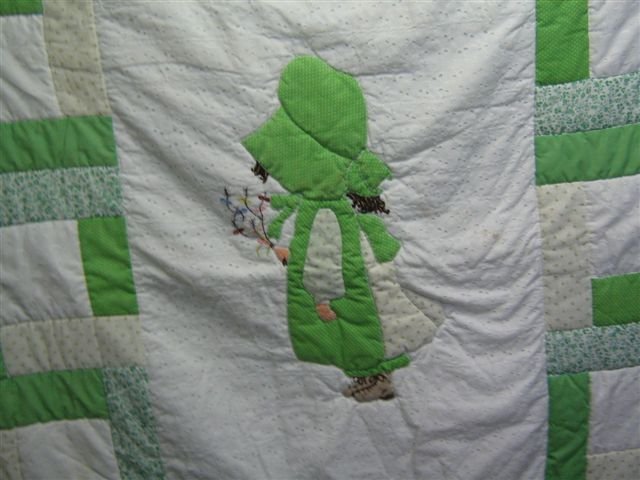 jasheeler Holly Hobby - Centre block is an appliqued Holly Hobby with hand embroidered flowers and hair. Surrounding the centre block are three patches in shades of green. My mom made this quilt for me. I remember helping her hand quilt it and then having it on my bed as a child and feeling super special because she had made it for me.