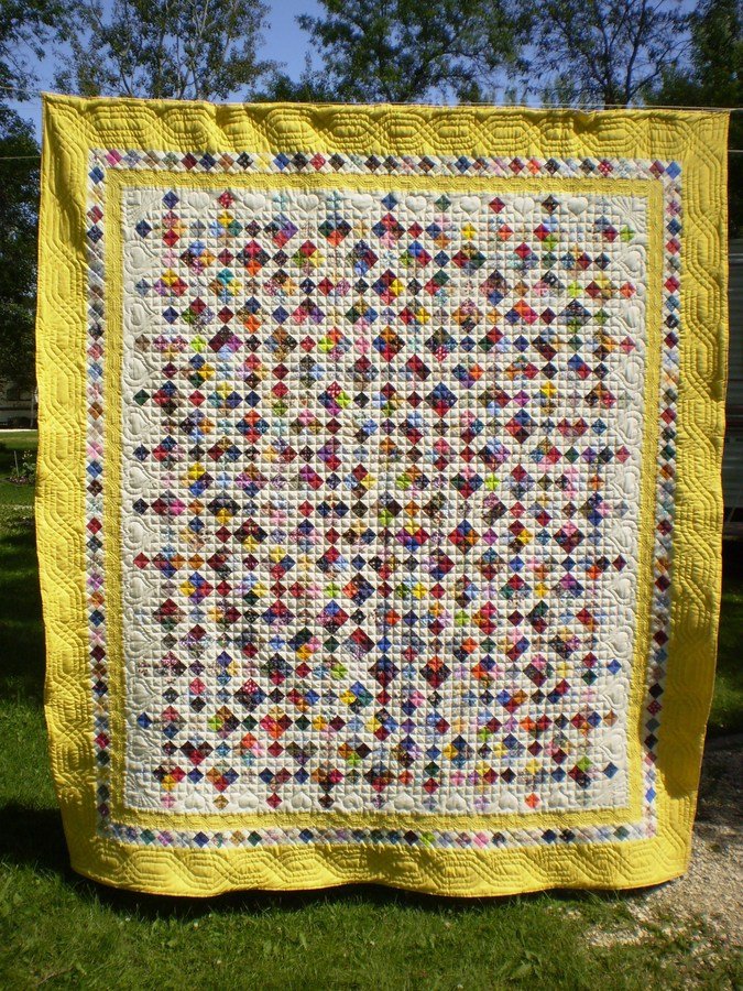 Goldenquilter Confetti - This quilt was made for my best friends 25th Wedding Anniversary. It took over 90 hours of hand quilting. It truley was a labour of love. My friend cryed when I presented it to her.