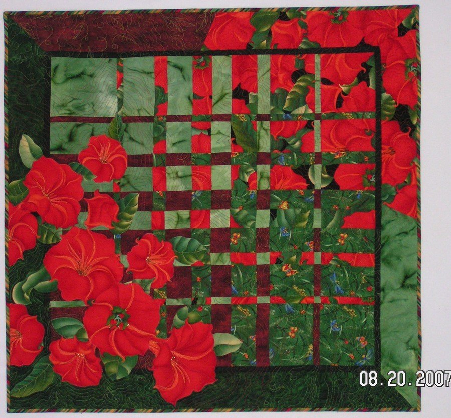 | Design Source - Description | Machine pieced, appliqued and free motion quilted, Red Glory was my first convergence quilt. It is embellished with thread painting and some beading. |