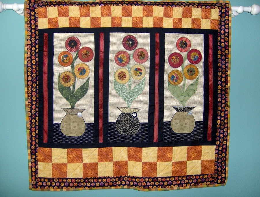 kella Helena's Yo-Yo Garden - This wall quilt was inspired after my grandma passed away. She was the one who taught me how to sew. There is a family story of grandma making yo-yo's when we were little. When she died, I found out my older sister already had Gram's yo-yo quilt in her posession. I was MAD, who said she could have the quilt...I proceeded to make yo-yo's for my own quilt someday. In the meantime, Helena's Yo-Yo garden was made in honor of my grandma, who was loved so much!