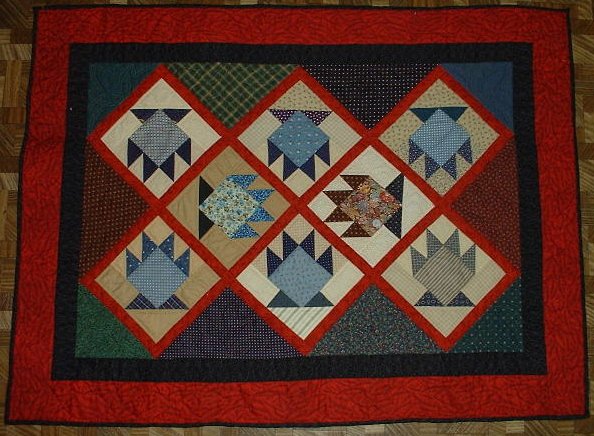 julie2066 Nebraska - Crib sized quilt made from scraps. Blocks are made from bear claw squares and adapted to baskets