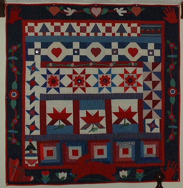 Red, White & Blue quilt with a variety of traditional blocks & applique in a row by row setting. No pattern for the quilt top. Quilt hangs in a bedroom. Handprints are quiltmaker, daughter & grand daughter. |