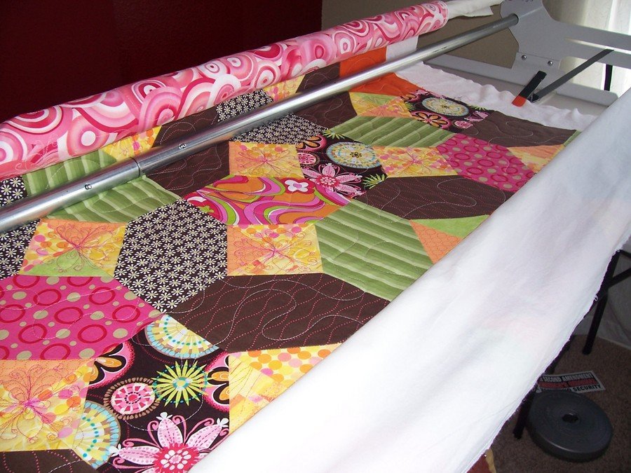 WagnerQuilting Funky Flowers - I found the fabric with the big pink flowers at the quilt show in Henderson, NV. I had no idea what I was going to do with it but I had to take it home. I found great retro fabrics that complimented it perfectly at Nancy's Quilt Shop. I wanted to do something simple because I wanted to make a large quilt in a couple months. I added more of the diamonds and took off the borders from the pattern. I am quilting the big flowers from my inspiration fabric in the diamonds and have done a very large meandering everywhere else.