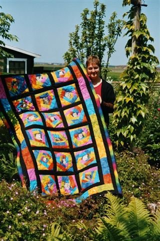 Miekenoor Kattenkop - My daughter left the house to study. I made her a bedquilt. She adores animals, especially cats. So I took fabrics with cats en made crazy bloks around those heads with bright colours and black. She still uses it, but not on her bed, but on her couch.