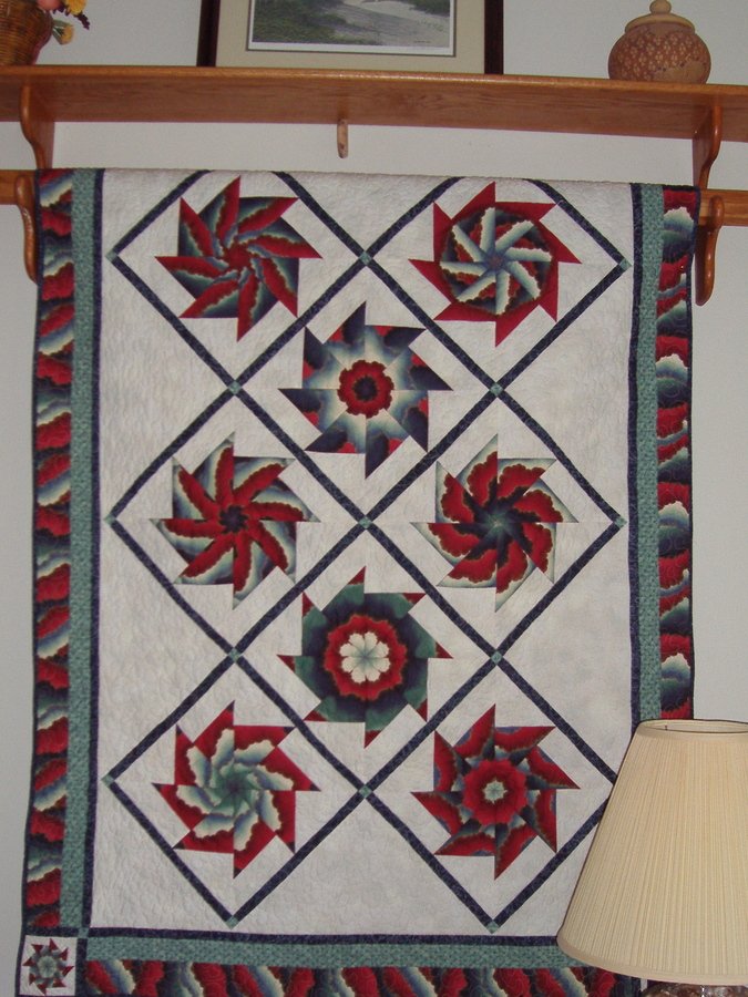 jkwelch Judy's Whackie Quilt - I bought the fabric without any idea what I was going to do with it. When a cousin wanted a quilt of these colors--I decided to try this fabric with this pattern. What a delight, it was so fun to see the various designs show up. I made two quilts and none of the squares looked the same. I modified the size of the pinwheel and did my own setting. I used some of the scrap "stacks" to make mini-pinwheels for the corners.