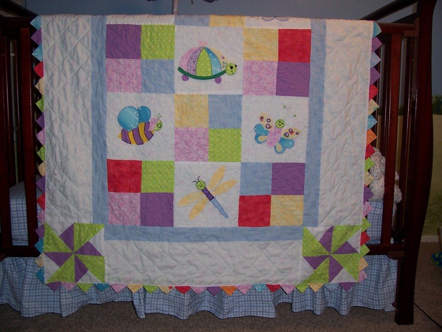 WagnerQuilting Baby Bugs - I made this quilt for my girly. It matches her room which is full of butterflies, dragonflies and lady bugs. I did all the straight line quilting on my home machine and the meandering around the applique bugs by hand. This is the only quilt I did any of the quilting by hand. I quickly found I don't have the patience to hand quilt. This quilt took me almost a year to complete.