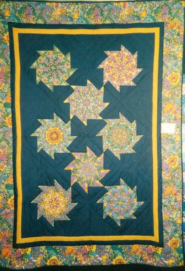 scottishquilter Jungle Fever Pinwheels - I bought the Parrot/Jungle fabric at a sale. Took it home and has no idea what to do with it, it was so colourful. I remembered I had the Magic Stack n' Whack book and used a pattern in it and toned it down with Navy fabric. I could possible make another two quilts with the amount of fabric that was left!!!!