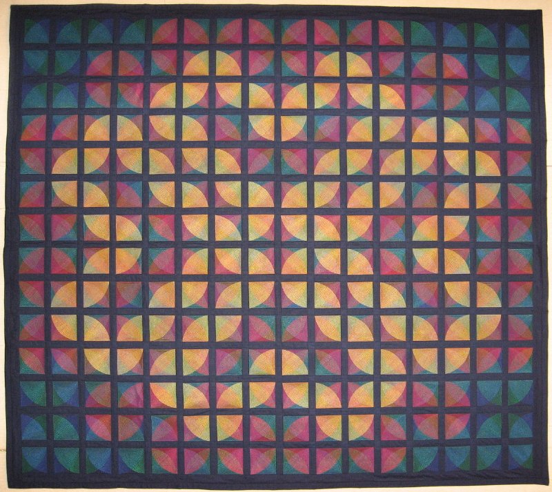 sylvainber 4 Hearts United by a Thread - This piece represents a full elaboration of the lines and color series, where ribbons of primary colors appear woven together in complex patterns that interact with the ambient light to produce a changing image depending on the light, viewing angle and distance. From the background to the foreground, the color layers are increasingly organized, each layer supporting the next, until the salient motif emerges in yellow: four hearts from a continuous loop which spans the entire quilt, all connected by tread.