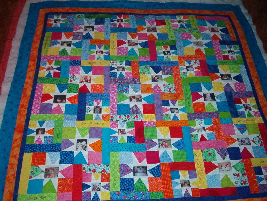 twkumro I Can Still Hear Your Voice - I made this quilt after my twin died. She had Down Syndrome, died of ovarian cancer. Pictures are slides from our life together and with my family. I wrote phrases she would say around the pictures, which gave the quilt its name.