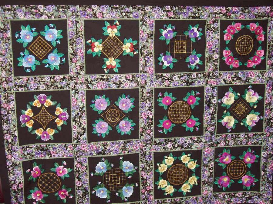 bizzybee85266 I'm Passionate about Pansy's - One of my first multi-hooped embroidered quilts. The designs are just gorgeous when stitched out, and the flowers on black are my all time favorite.