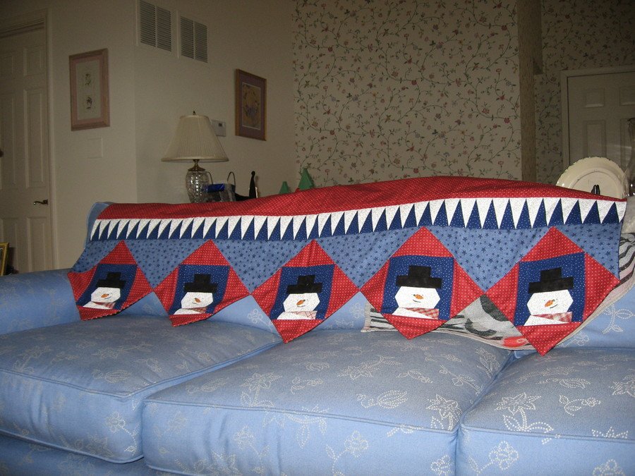 sweener87 Snowman Mantel Quilt - My granddaughter, Hannah Good, loves snowmen. My daughter Anne used to live in Oak Park, Illinois, but she and her husband Matt now live in Nashville, Tennessee, where it doesn't snow that much. I promised Hannah a snowman quilt for their use at Christmastime.