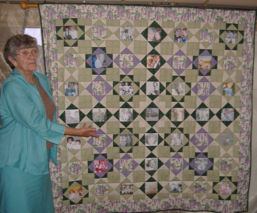 dogquilter To My Mother on her Seventieth Birthday - I made this pictorial quilt for my Mother's 70th birthday. I had help with donated pictures from her siblings. She was delighted with the quilt and shocked with photos she had never seen. I selected a wisteria fabric as the focus fabric because the family home in the middle of the quilt was adorned with wisteria over the porch.