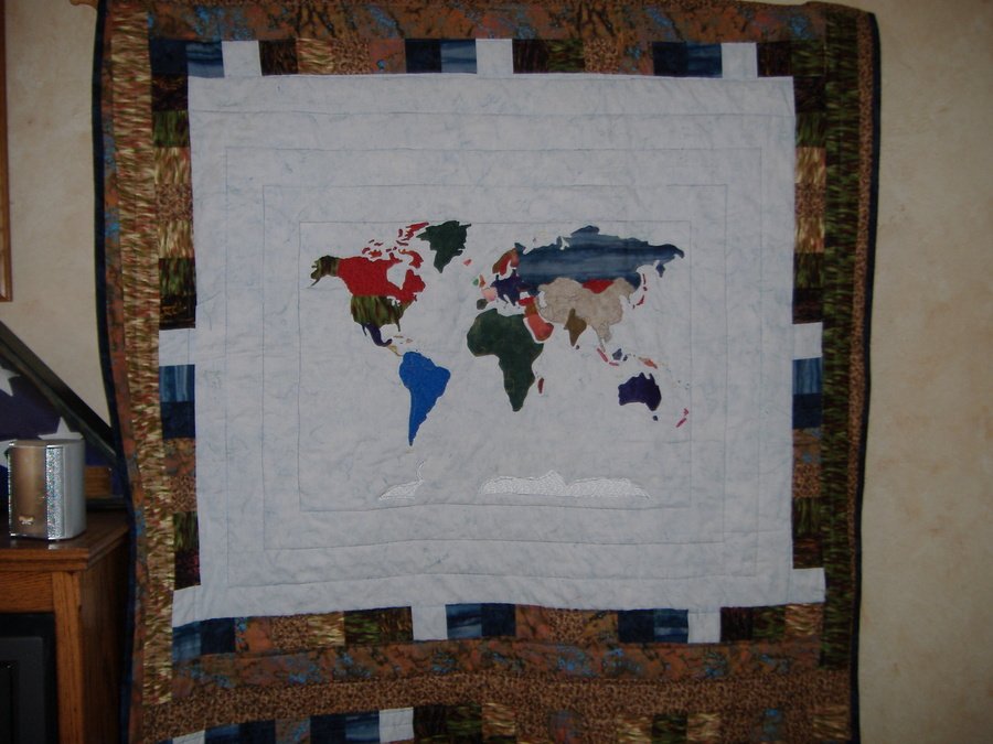 dogquilter Back of the Amy's Trip Around The world - This quilt was made for my daughter before she took a trip around the world. She carried this quilt from Lompoc Calif, to London England, Sweden, Turkey, Dubai, Singapore, Australia and back home to Lompoc.