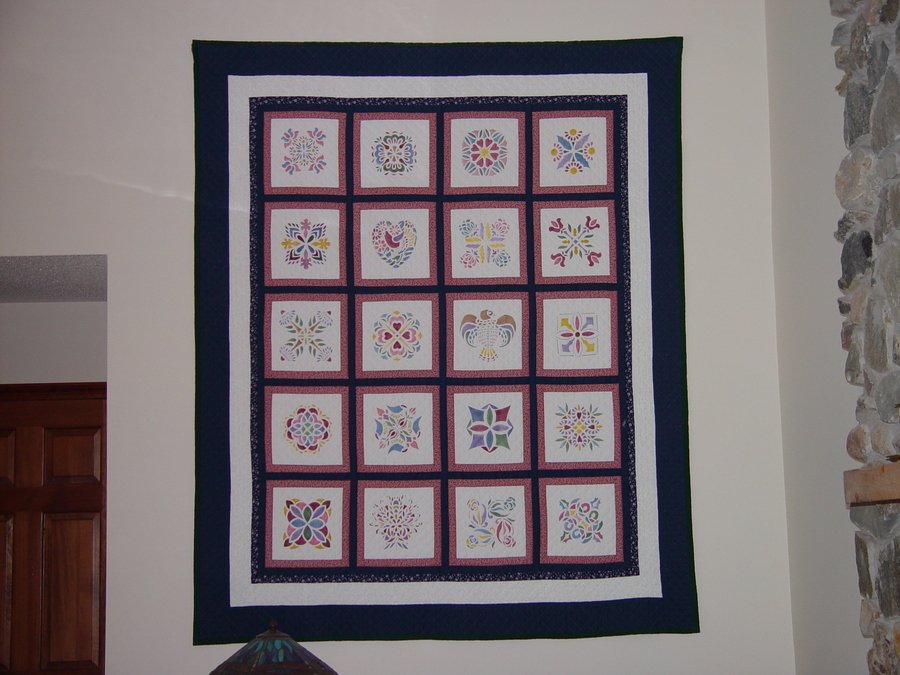 Quiltmomma70 Stenciled Sampler - The stencils in the book were not cut out. I hand-cut the stencils myself with an exacto knife, then used solid stencil paint with a dry-brush method to paint the quilt blocks. This was very time-consuming, but I enjoyed the results immensely.
