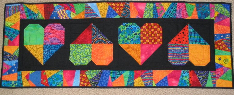 TQSWizard Crazy Hearts - This was a guild project. Everyone else made theirs with pink and white. I had to color outside of the lines and do it in brights. It lays on our dining room table every February.