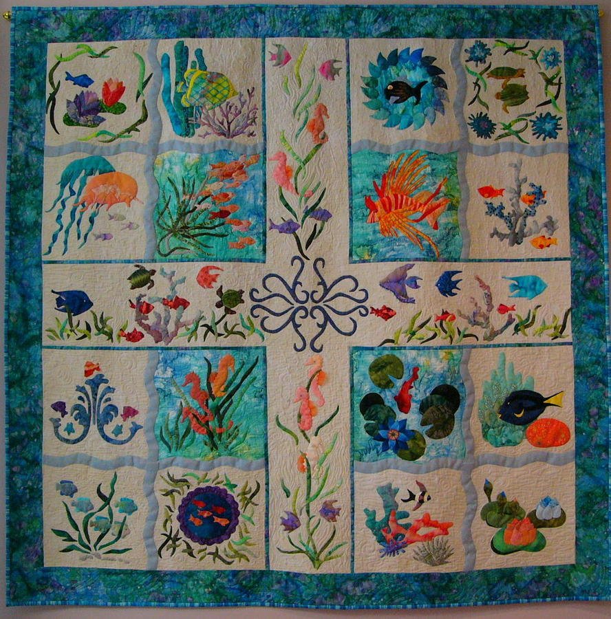 kimbabcockquilts Fantasy Fish - I used needle turn appliqué to create the miniature fish and sea creatures which come to life with tiny details. It is embellished with beads, sheer ribbon and shimmery threads.