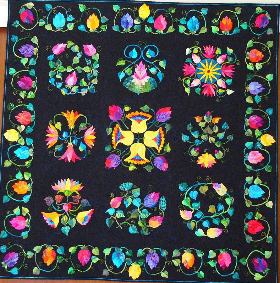 | Design Source - Description | Needle turn appliqué is the technique used here. I love how the bright batik fabrics sparkle against the dark pool of water background. |
