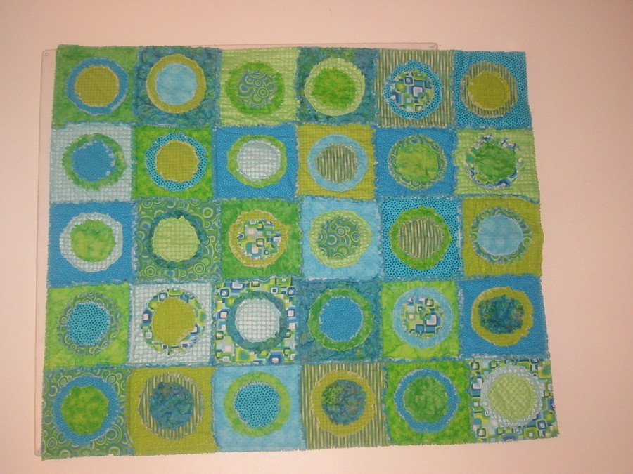 MontanaGramma Ragtime Circle Quilt - My 10 yr. old granddaughter, Kessley, chose the colors and design to coordinate with her bedroom. Then she sewed all the layers together using the Bernina circular embroidery attachment to sew on the circles. I sewed all the squares together and did the cutting to make it a ragtime.
