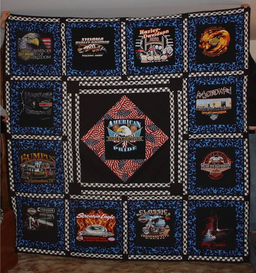 ultrasmallman Harley T-Shirt Quilt - Quilt was made from donated t-shirts and blue flame cotton, back with an American Flag patterned fleece. It was raffled by Toledo Harley for Muscular Dystrophy. Raised $700.