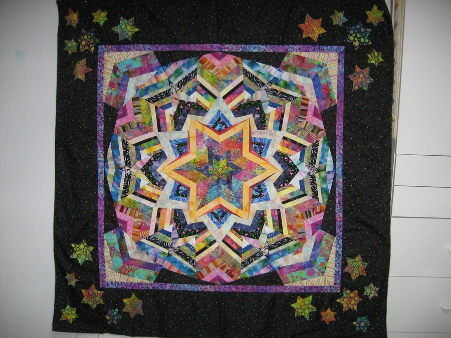 patches188 Star Burst Kaleidoscope - I took a class from Ricky Tims, in March of 2005 to learn how to make this quilt. It is still in the making. I would like to add swarovksy crystals to the quilt, after it is quilted. I haven't decided on the quilting pattern, or where the crystals will go.