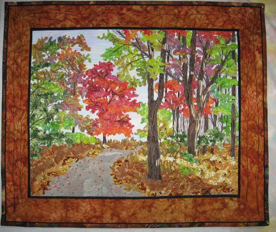 patches188 Fall Festival - I took a class from Sue Gilgen and used her technique to create this quilt. I took a picture of my driveway in the fall and recreated it into this quilt. I used batiks to capture the gorgeous colors of the maple leaves. It's fusible applique and free motion machine quilted.