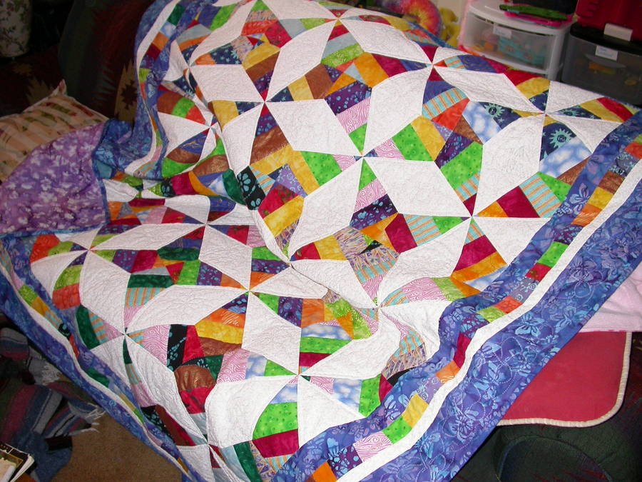 quiltydoc Butterfly Angel - The quilt pattern in the book was incorrect, so I changed the angles, and decided to go brighter and use mostly batiks. I machine quilted in the ditch in the main seams, but in the small strip seams, and inside the white blocks, I hand quilted. The border is completely handquilted too, with butterflies. My favorite motif in this quilt, is a butterfly angel, which I quilted in two of the white diamonds. It was inspired by a song "Butterfly Angel" by my friend and very talented singer, John Suchocki, a PhD Chemist who also has a secondary love in the arts, as do I.
