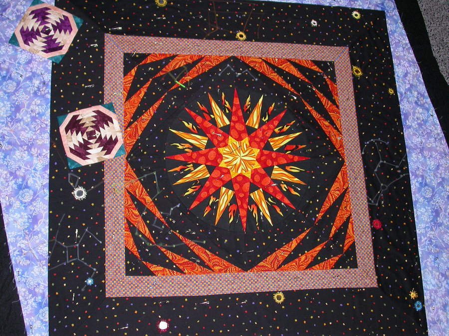 quiltydoc Great Eastern Sun - Friends of mine are Buddhists, and came for a visit. While here, they discussed the concept of the Great Eastern Sun. I wanted to make a quilt wall hanging for them. I've experimented with embroidering little mirrors on it to look like small stars in the background.