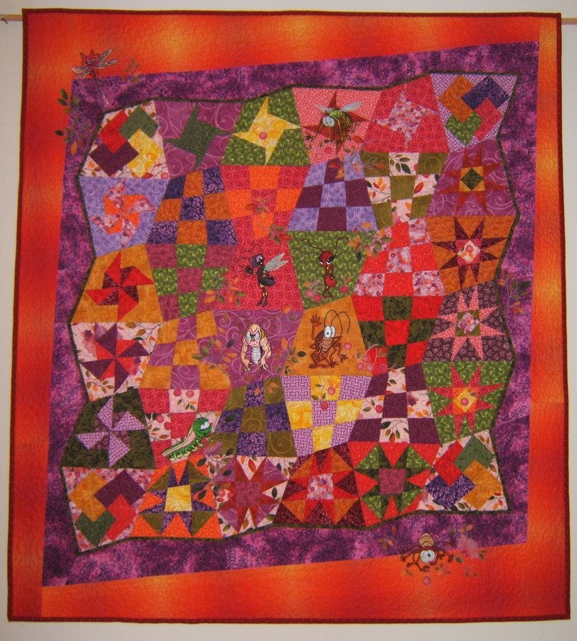 MiniGoddess Gone Bug-zurk - This was my first attempt at skewed settings with a skewed border. I emboidered directly on the quilt top. "Fun" sums it up.