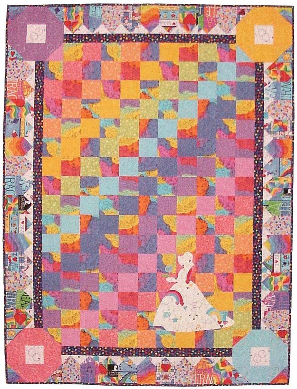 ajclapp Rainbow of Love - This was a donation quilt for the Quilt of Dreams. I made it at the same time I was making my daughter's wedding quilt. The bride, picket fence border, and wedding ring corners were added to the quilt design after reading Briana dreamed for rainbows and getting married. Interlinking rings are embroidered in the center of the wedding ring blocks and the bride holds a yo-yo flower.