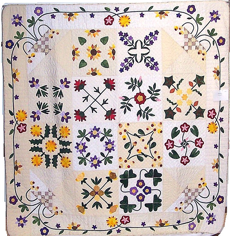 NancyAnn1959 Prairie Flowers - These 16" blocks were hand appliqued. The baskets were machine pieced. The quilt was entirely hand quilted. The quilt took a full year to complete. There are 4 different background fabrics. My quilting included some colored thread for embellishment.