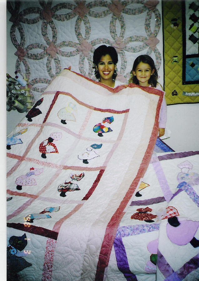 grandbysquilts Virginia's Kids - There are two quilts, a mauve and a purple for Virginia's two little girls. Each piece of Sunbonnet's outfits were cut from the girls' outgrown baby dresses. It's a fusible method, then satin stitched around the edge.