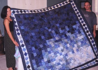 grandbysquilts Barb's Watercolor - Made as a wedding gift for a couple whose favorite color was blue. There were 30 different fabrics used, all 3" squares. It took about 2 months to get the squares right where I liked them before piecing and quilting. It was my first watercolor.