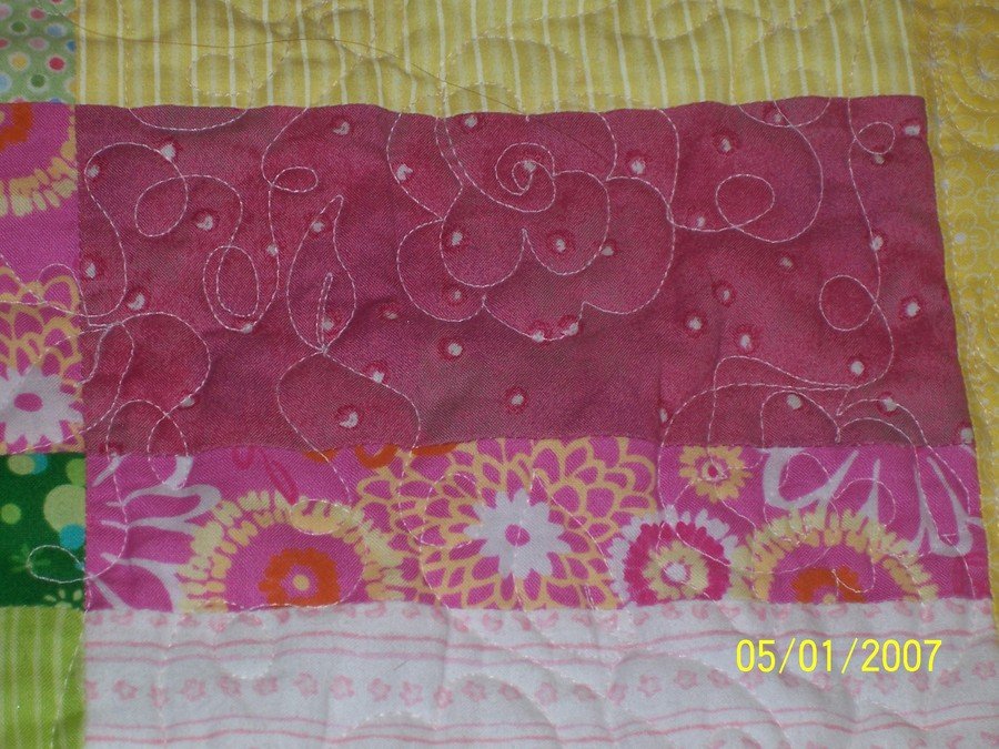 WagnerQuilting Rachael - I made this quilt for my best friend when her second daughter was born. Although the pattern wasn't for a baby quilt, in pinks and greens, it turned out perfect for a baby girl. The pattern is pieced rectangles with sashing and squares in between. I quilted it with playful flowers, leaves and loops. The borders are quilted in spirals.