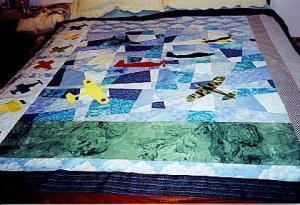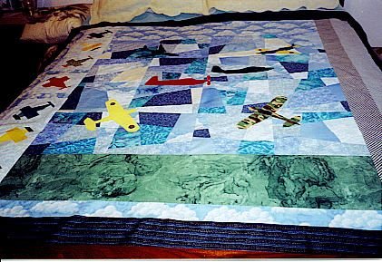 | Design Source - Description | Airplanes in flight, from the earliest vintage to jets and Heliocopters. Edge is paper pieced simple airplane shapes. Machine pieced and quilted on a Bernina sewing machine, 1230. |