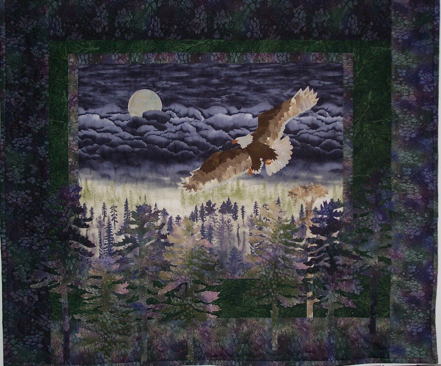 she-quilts Eagle Quilt - My guild secret sister gave me the pattern in '06. I found a kit of fabrics to complete the top at Susan's Calico Creations in Fulton, IL. The cutting of each tree took 45 mins. Lots of little cutting! This hangs above my computer area and I love it. :-)
