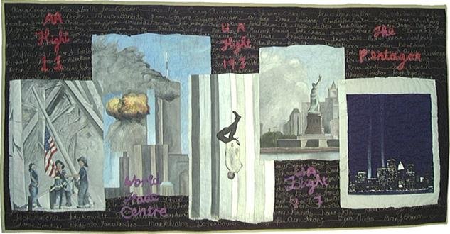 hatshepsut Heroes and Victims - Panels painted on the backes of my old police shirts representing 911 from devastation to the start of recovery. Background quilted with a diverse selection of vitims' names.
