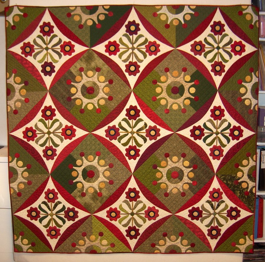 Margo Winter Dance - It's basically a red and green quilt but the variety of fabrics makes this a pleasing quilt to look at any time of the year. I needed a take-along project, so I hand appliqued all the elements then machine quilted it with outlines, echos, stippling, cross-hatches and feathers.