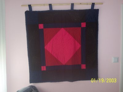 | Design Source - Description | Present for my husband for our 10th. I wanted to emulate intense Amish colors, and added a non-conventional touch with gold stitching. |