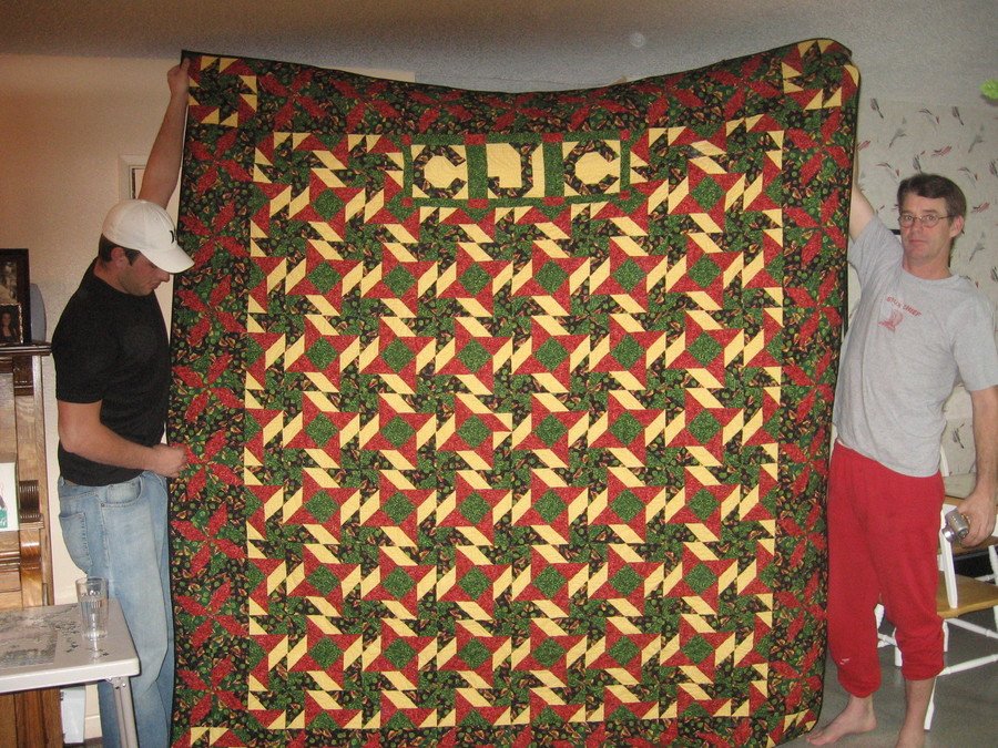 DQuilt Chris's Christmas Quilt - This quilt took 2 1/2 years to complete and has nearly 3000 pieces. It is made from the "Early American Tinware" collection and has just one block pattern (yankee puzzle) for both the center and border(except 3 blocks are comprized of initials).
