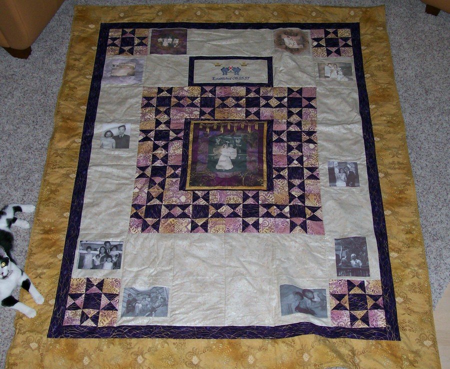 AbeClochie Wong's 50th Anniversary - I designed this quilt using EQ5 software, Digital Scrapbooking Software, Photoshop Elements 5 for photo editing, Embird Embroidery software for the embroidery work, Kaleidoscope Kreater 2.0 software for backgrounds to some of the photos.
