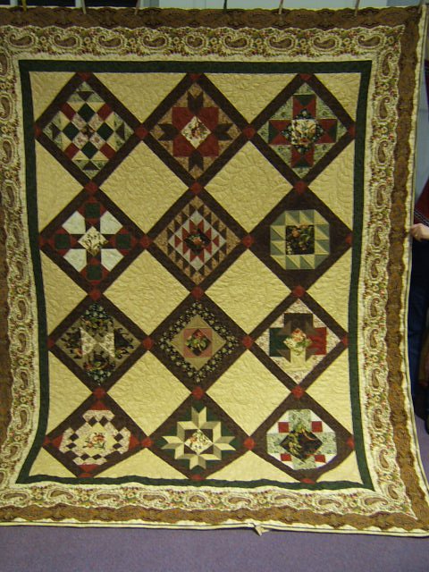 overjoy25 Lori's Quilt - Quilt was made by taking the 2005 Practically Free Quilt classes by Ruth Stonesifer, using sampler blocks she designed from EQ5. I used most of her blocks, but she encourages creativity so I redesigned some of the blocks on my EQ5. The border fabric was fun to work with and I learned how to match the corners and middle by watching a Simply Quilts program several years ago.