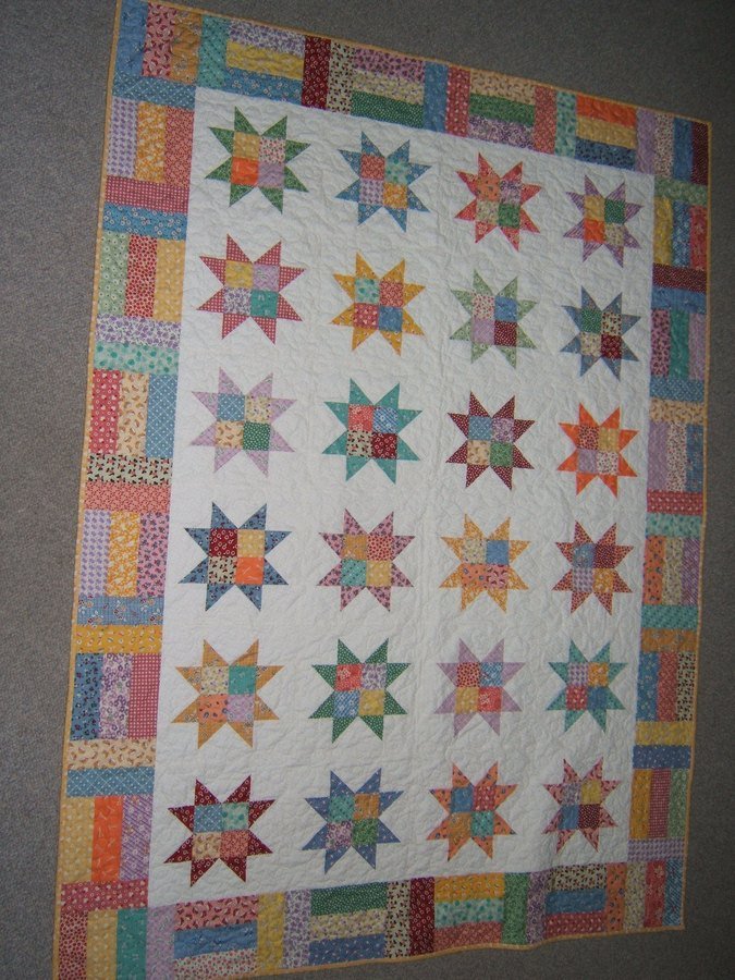 overjoy25 Stars and Strips - A friend of mine who works at Country Quiltworks asked me to make this quilt as a sample for the store. She knows I like 30's fabrics and I was happy to do it til I found out it had to be done in 4 weeks! But I did it! It was ready for the class (of course, I delivered it just a few hours before the class!)